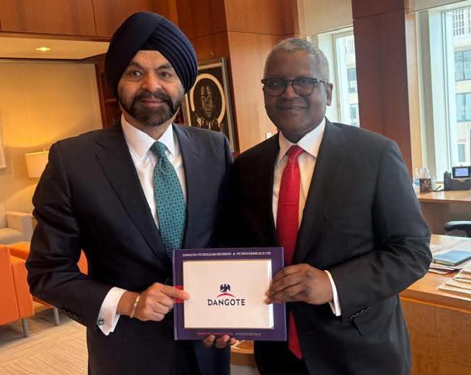 The President/Chief Executive of Dangote Industries Limited, Aliko Dangote (right) presenting a souvenir to the President of World Bank Group, Mr. Ajay Banga during a meeting in his office on Thursday at the side of the IMF/WBG Spring Meetings in Washington DC, USA.